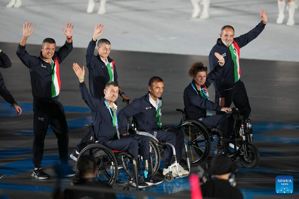 Members of the delegation of Italy parade during the opening ceremony of the World Games 2025 in Chengdu, southwest China's Sichuan Province, on Aug. 7, 2025, (Xinhua/Jiang Hongjing)