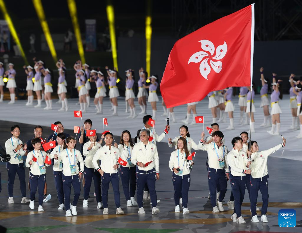 Members of the delegation of China's Hong Kong parade during the opening ceremony of the World Games 2025 in Chengdu, southwest China's Sichuan Province, on Aug. 7, 2025. (Xinhua/Jiang Kehong)