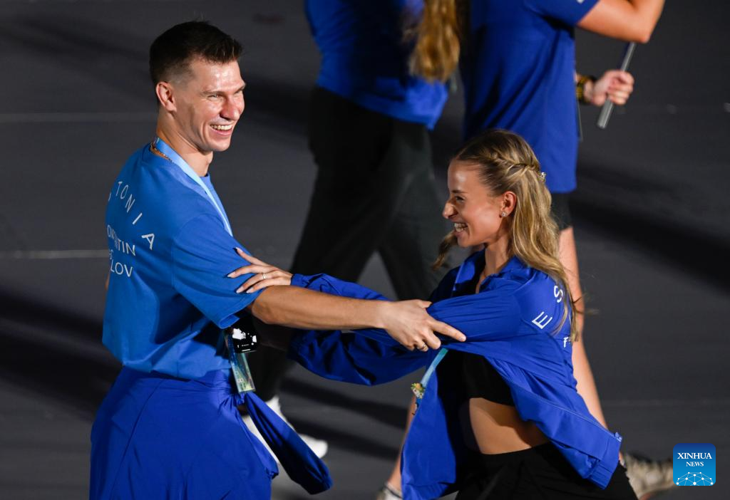 Members of the delegation of Estonia dance during the opening ceremony of the World Games 2025 in Chengdu, southwest China's Sichuan Province, on Aug. 7, 2025. (Xinhua/Bao Feifei)