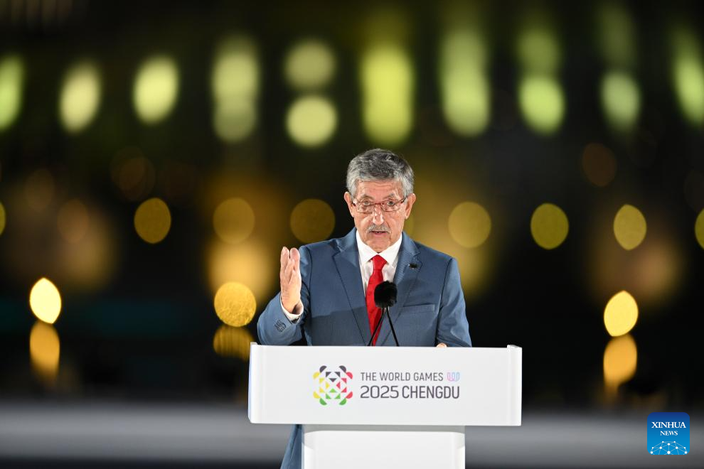 International World Games Association (IWGA) President Jose Perurena Lopez delivers a speech during the opening ceremony of the World Games 2025 in Chengdu, southwest China's Sichuan Province, on Aug. 7, 2025. (Xinhua/Chen Zhenhai)