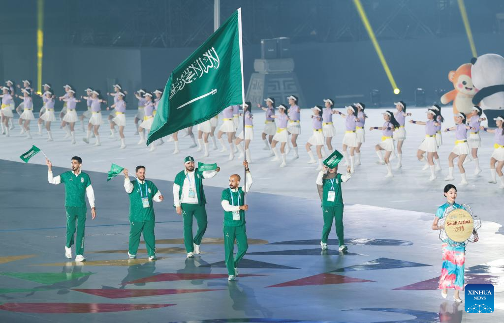 Members of the delegation of Saudi Arabia arrive for the opening ceremony of the World Games 2025 in Chengdu, southwest China's Sichuan Province, on Aug. 7, 2025. (Xinhua/Jiang Kehong)