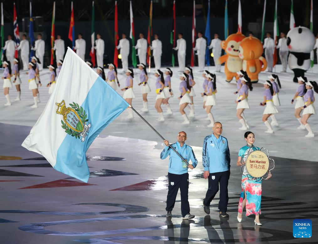 Members of the delegation of San Marino parade during the opening ceremony of the World Games 2025 in Chengdu, southwest China's Sichuan Province, on Aug. 7, 2025. (Xinhua/Jiang Kehong)