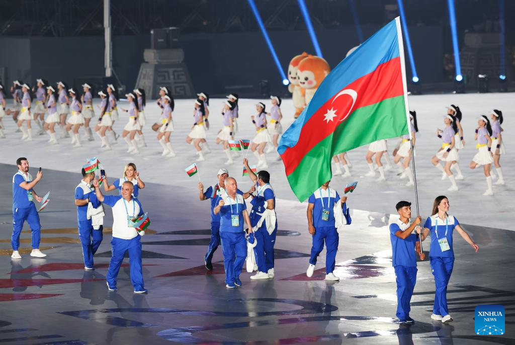 Members of the delegation of Azerbaijan parade during the opening ceremony of the World Games 2025 in Chengdu, southwest China's Sichuan Province, on Aug. 7, 2025. (Xinhua/Jiang Kehong)