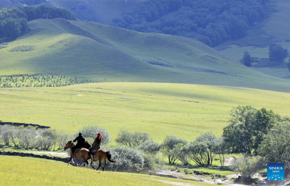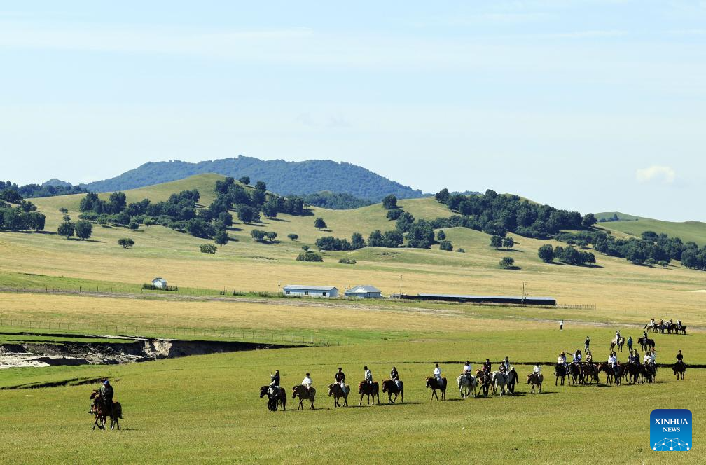 Tourists ride horses on the Ulan Butong grassland in Hexigten Banner of Chifeng, north China's Inner Mongolia Autonomous Region, Aug. 7, 2025. Rich in natural tourism resources, the Ulan Butong scenic area features lakes, grasslands, and forests, attracting numerous visitors. (Xinhua/Jia Lijun)