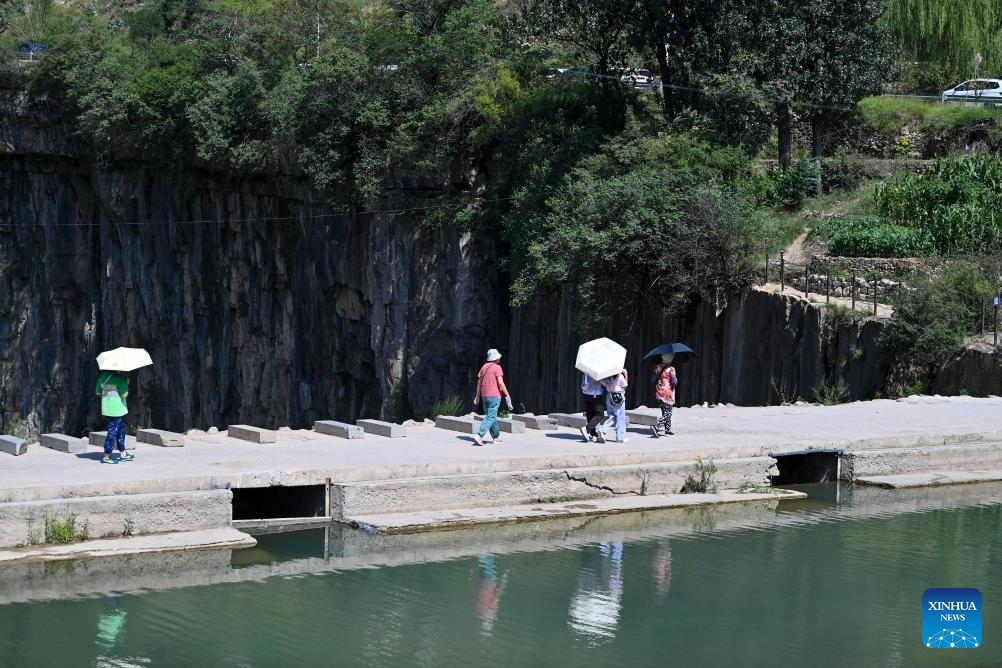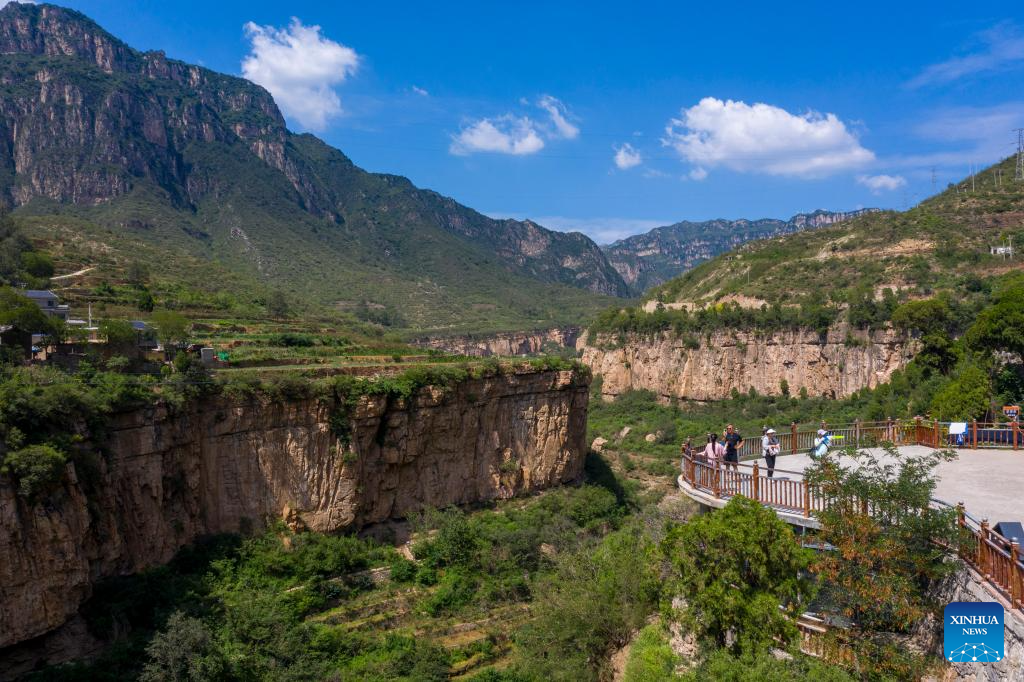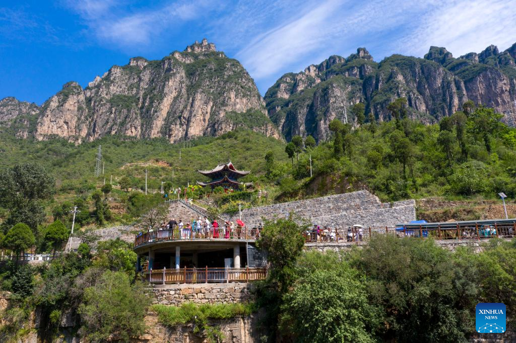 Tourists visit Hongni Village in Pingshun County, north China's Shanxi Province, Aug. 6, 2025. Hongni Village has ushered in its peak tourism period. The village, nestled deep in the Taihang Mountains, has a long history and is known as the "ancient village on the cliff."