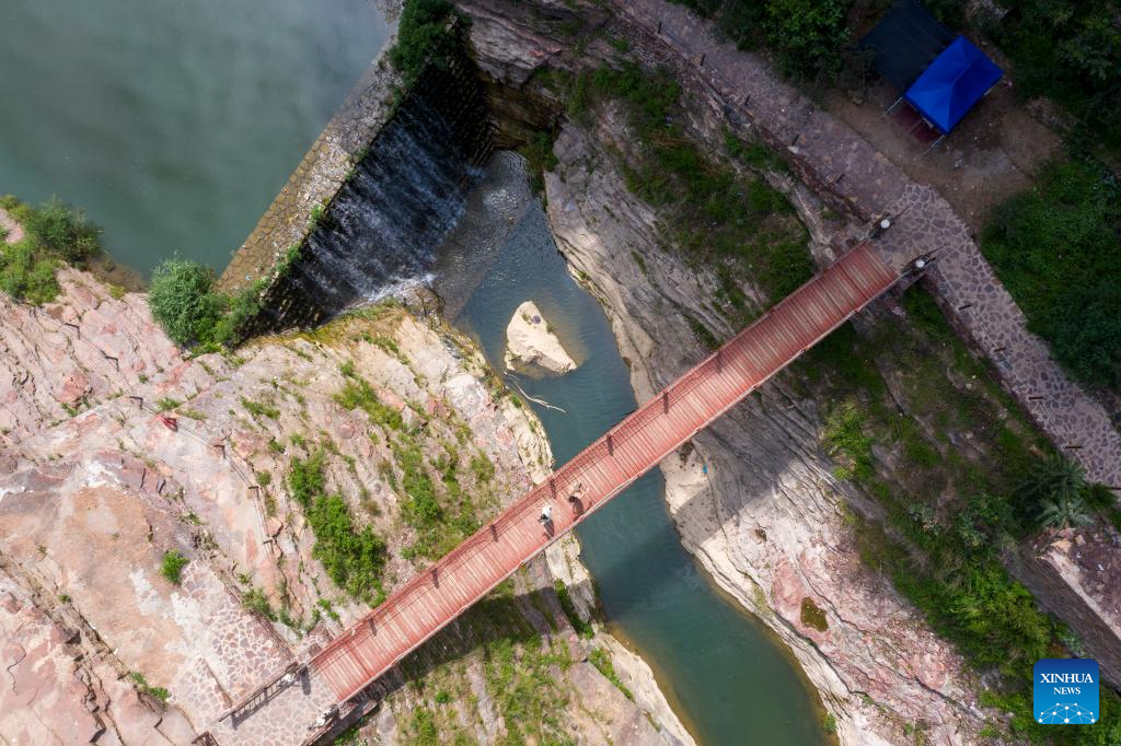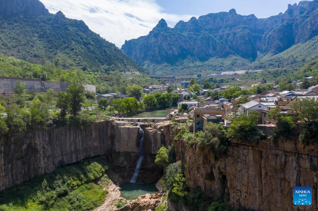 An aerial drone photo taken on Aug. 6, 2025 shows a view of the Taihang Mountain around Hongni Village in Pingshun County, north China's Shanxi Province. Hongni Village has ushered in its peak tourism period. The village, nestled deep in the Taihang Mountains, has a long history and is known as the "ancient village on the cliff."