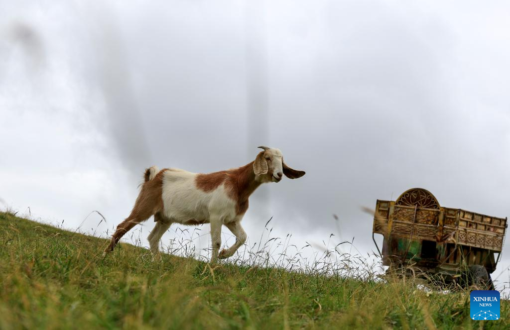 A goat is seen at Kunlun Mountains scenic area in Qira County, northwest China's Xinjiang Uygur Autonomous Region, Aug. 6, 2025. Known for its unique natural beauty and rich cultural heritage, Kunlun Mountains scenic area has attracted numerous visitors during summer vacation. (Xinhua/Wang Fei)