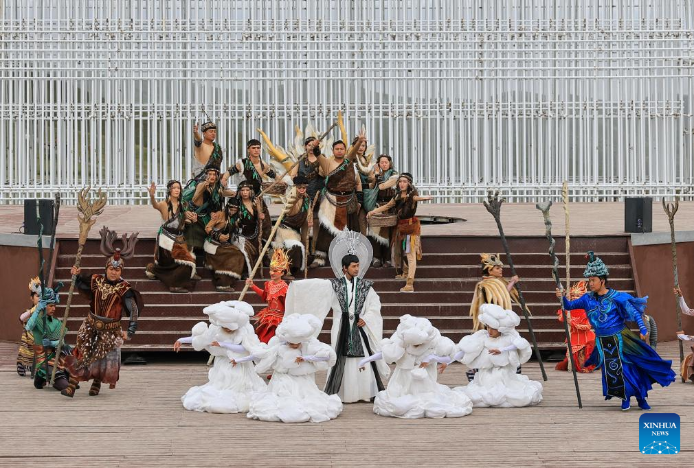 Artists perform drama at Kunlun Mountains scenic area in Qira County, northwest China's Xinjiang Uygur Autonomous Region, Aug. 6, 2025. Known for its unique natural beauty and rich cultural heritage, Kunlun Mountains scenic area has attracted numerous visitors during summer vacation. (Xinhua/Wang Fei)