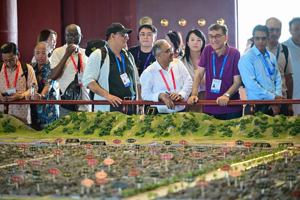 Guests attending the Shanghai Cooperation Organization (SCO) Media and Think Tank Summit visit the Dingding Gate Site Museum in Luoyang, central China's Henan province, on July 26, 2025. (Photo/Li Weichao)