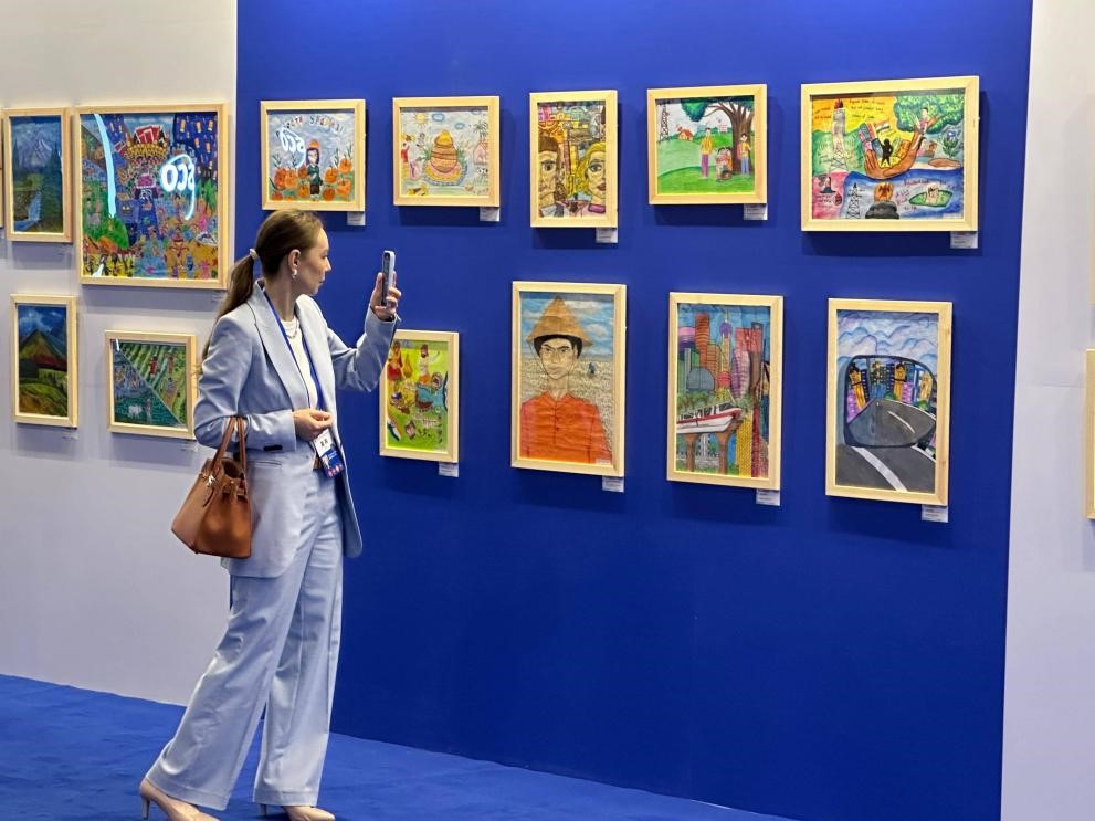 A guest visits a children's arts exhibition during the 2025 Shanghai Cooperation Organization (SCO) Forum on People-to-People Friendship and the Forum on Friendship Cities in Shenyang, northeast China's Liaoning province. (People's Daily/Hu Jingyi)