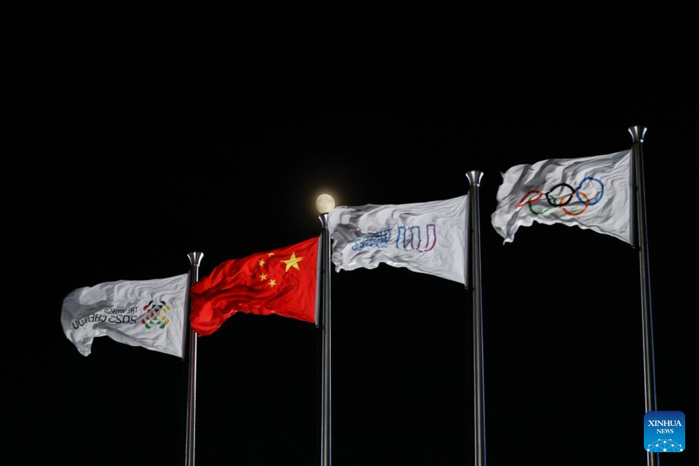 The flag of the International Olympic Committee, the flag of the International World Games Association, the Chinese national flag and the flag of the Organising Committee of the World Games 2025 Chengdu (R to L) are seen during the opening ceremony of the World Games 2025 in Chengdu, southwest China's Sichuan Province, on Aug. 7, 2025. (Xinhua/Chen Cheng)