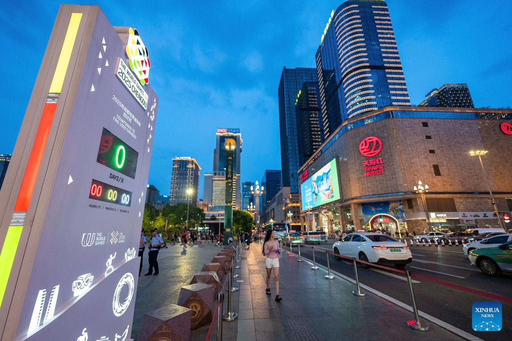 A countdown clock is seen in Tianfu Square as the opening ceremony of the World Games 2025 begin in Chengdu, southwest China's Sichuan Province, on Aug. 7, 2025. (Xinhua/Xie Jianfei)