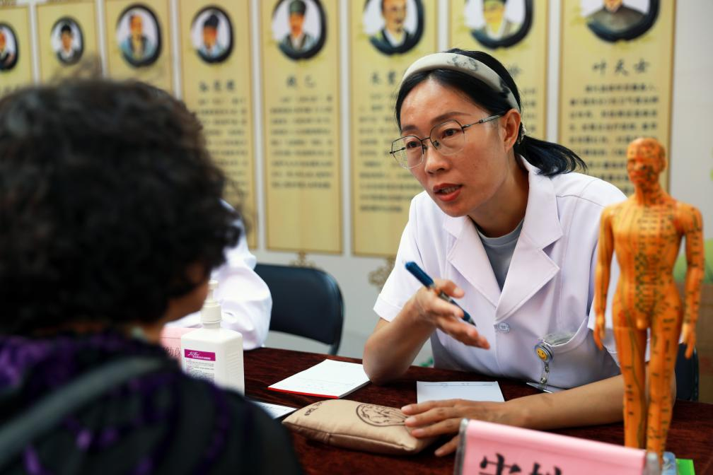 Song Wanling (R), a doctor of a maternal and child health care hospital in Baiyin, offers free consultation services at the "Traditional Chinese Medicine (TCM) Night Market" in Baiyin City, northwest China's Gansu Province, July 15, 2025. (Xinhua/Guo Gang)