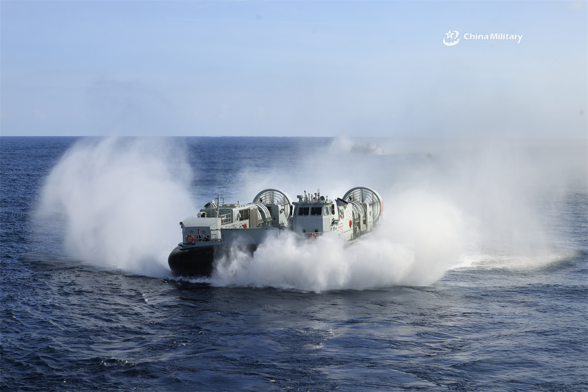 Landing craft air cushions (LCACs) attached to a landing ship group with the navy under the Chinese PLA Southern Theater Command steam in line formation to the beachhead at lightning speed during a maritime training exercise in summer day. (eng.chinamil.com.cn/Photo by Zhang Xueyan)