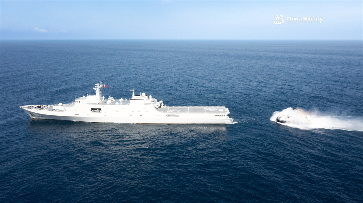 Landing craft air cushions (LCACs) attached to a landing ship group with the navy under the Chinese PLA Southern Theater Command prepare to steer into the well deck of the amphibious dock landing ship Wuzhishan (Hull 987) during a maritime training exercise in summer day. (eng.chinamil.com.cn/Photo by Zhang Xueyan)