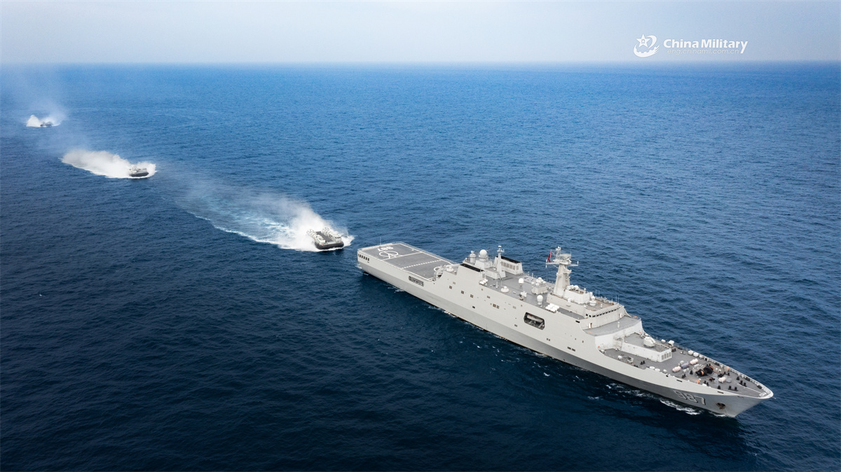 Landing craft air cushions (LCACs) attached to a landing ship group with the navy under the Chinese PLA Southern Theater Command prepare to steer into the well deck of the amphibious dock landing ship Wuzhishan (Hull 987) during a maritime training exercise in summer day. (eng.chinamil.com.cn/Photo by Zhang Xueyan)