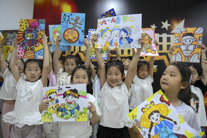Children show their paintings at a studio in Xiayi county of Shangqiu, Central China's Henan province, June 1, 2025. [Photo/Xinhua]