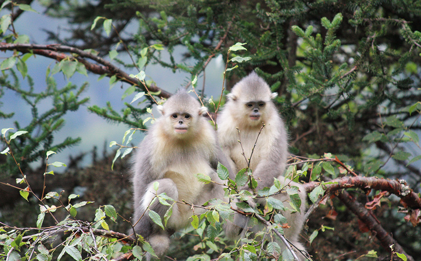 Black-and-white snub-nosed monkeys are seen at the Xiangguqing area of the Baima Snow Mountain National Nature Reserve in Weixi county, Diqing Tibetan Autonomous Prefecture, southwest China's Yunnan Province. (People's Daily Online/Mu Shengyu)