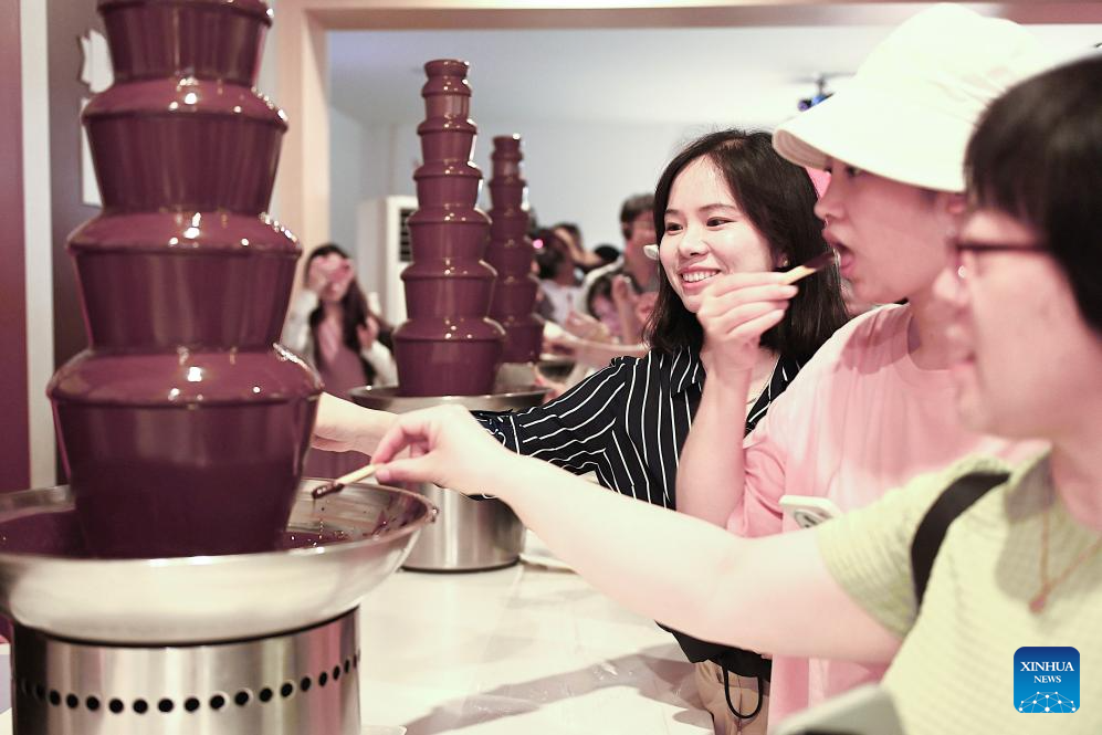 Tourists taste chocolate at Aficion Chocolate Village in Miaojia Village in Jiashan County of Jiaxing City, east China's Zhejiang Province, Aug. 7, 2025. In recent years, Miaojia Village has developed two national-level tourist attractions, including Aficion Chocolate Village and Biyun garden, and established an intangible cultural heritage exhibition hall, promoting the integrated development of ecological conservation and the economy. (Xinhua/Mao Zhu)
