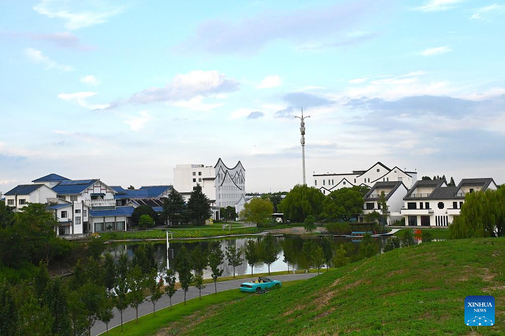 This photo taken on Aug. 7, 2025 shows a view of Miaojia Village in Jiashan County of Jiaxing City, east China's Zhejiang Province. In recent years, Miaojia Village has developed two national-level tourist attractions, including Aficion Chocolate Village and Biyun garden, and established an intangible cultural heritage exhibition hall, promoting the integrated development of ecological conservation and the economy. (Xinhua/Mao Zhu)