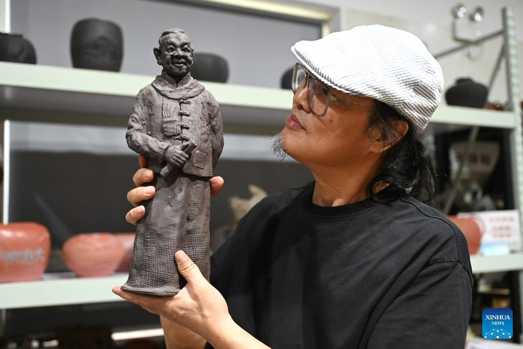 Ding Hailong, an inheritor of clay sculpture craftsmanship, displays a clay sculpture at Miaojia Village in Jiashan County of Jiaxing City, east China's Zhejiang Province, Aug. 7, 2025. In recent years, Miaojia Village has developed two national-level tourist attractions, including Aficion Chocolate Village and Biyun garden, and established an intangible cultural heritage exhibition hall, promoting the integrated development of ecological conservation and the economy. (Xinhua/Mao Zhu)