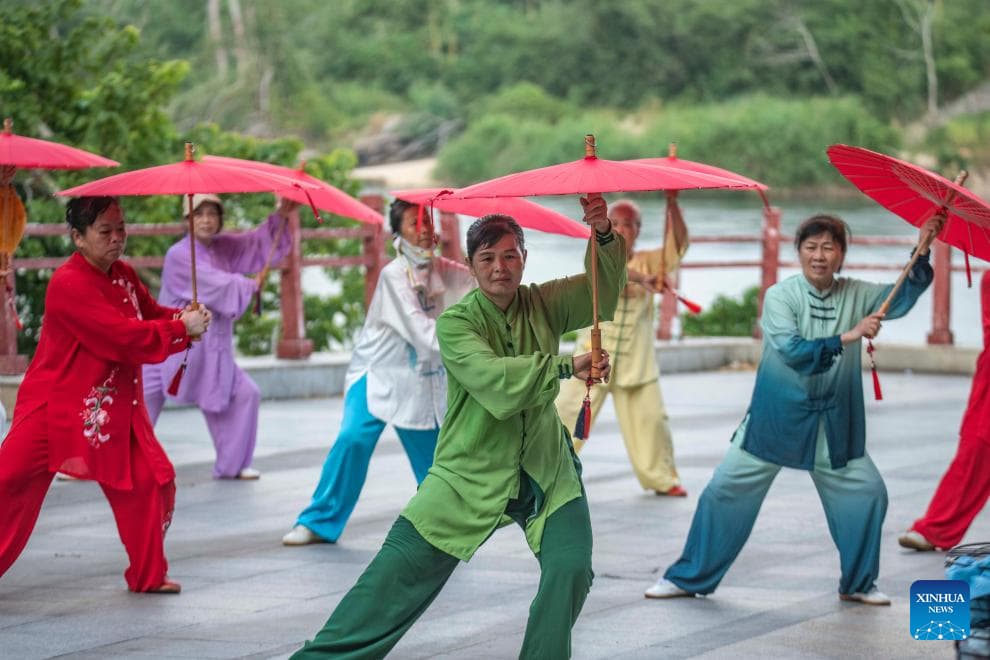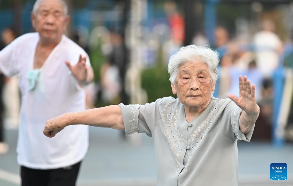 Senior citizens practice Tai Chi at a park in Tengzhou City, east China's Shandong Province, Aug. 8, 2025. As the country marks National Fitness Day this Friday, a legacy of the 2008 Beijing Olympics, more people are embracing active lifestyles. (Photo by Li Zhijun/Xinhua)