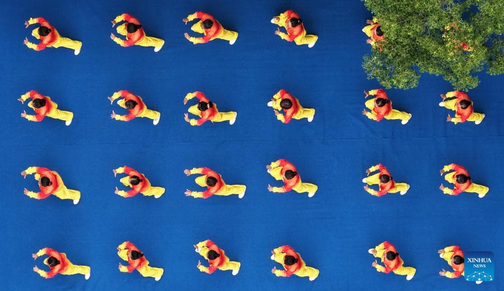 An aerial drone photo taken on Aug. 8, 2025 shows people practicing Tai Chi at a park in Yangzhou City, east China's Jiangsu Province. As the country marks National Fitness Day this Friday, a legacy of the 2008 Beijing Olympics, more people are embracing active lifestyles. (Photo by Meng Delong/Xinhua)