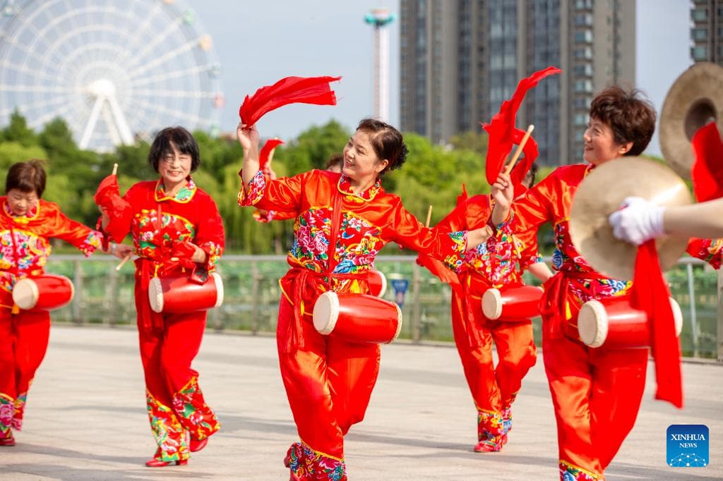 Amateurs practice waist drum at a park in Nantong City, east China's Jiangsu Province, Aug. 8, 2025. As the country marks National Fitness Day this Friday, a legacy of the 2008 Beijing Olympics, more people are embracing active lifestyles. (Photo by Zhai Huiyong/Xinhua)