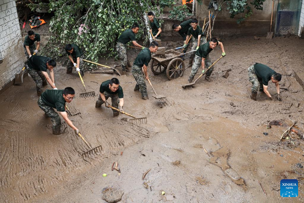 Members of the People's Armed Police Force Gansu Corps clean up mud in Xinglongshan Village, Yuzhong County of northwest China's Gansu Province, Aug. 10, 2025. The People's Armed Police Force (PAPF) Gansu Corps mobilized over 400 officers and soldiers on Sunday, deploying them to several villages in Yuzhong County, including Xinglongshan, Maliantan, Xiaokangying, and Jiuzhuanggou. The forces will conduct disaster relief work, which includes searching for missing individuals, roadway clearing, transferring materials, and disinfecting affected areas. (Photo by Hou Conghui/Xinhua)