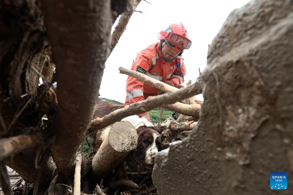 A member of the People's Armed Police Force Gansu Corps searches for missing individuals in Maliantan Village, Yuzhong County of northwest China's Gansu Province, Aug. 10, 2025. The People's Armed Police Force (PAPF) Gansu Corps mobilized over 400 officers and soldiers on Sunday, deploying them to several villages in Yuzhong County, including Xinglongshan, Maliantan, Xiaokangying, and Jiuzhuanggou. The forces will conduct disaster relief work, which includes searching for missing individuals, roadway clearing, transferring materials, and disinfecting affected areas. (Photo by Liu Yabin/Xinhua)
