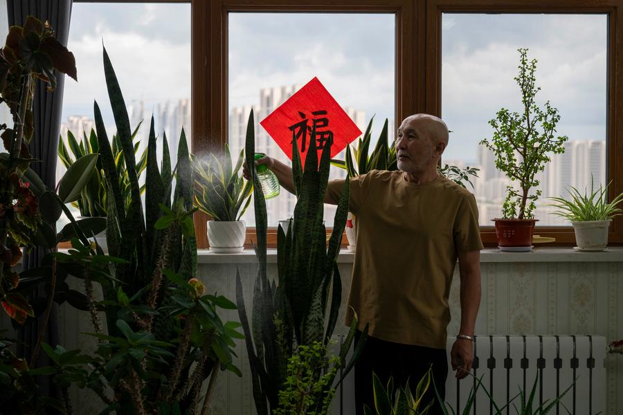 Saulebek Kabylbekov waters the plants at his apartment in Daqing City, northeast China's Heilongjiang Province, July 16, 2025. (Xinhua/Zhang Tao)