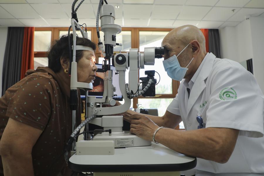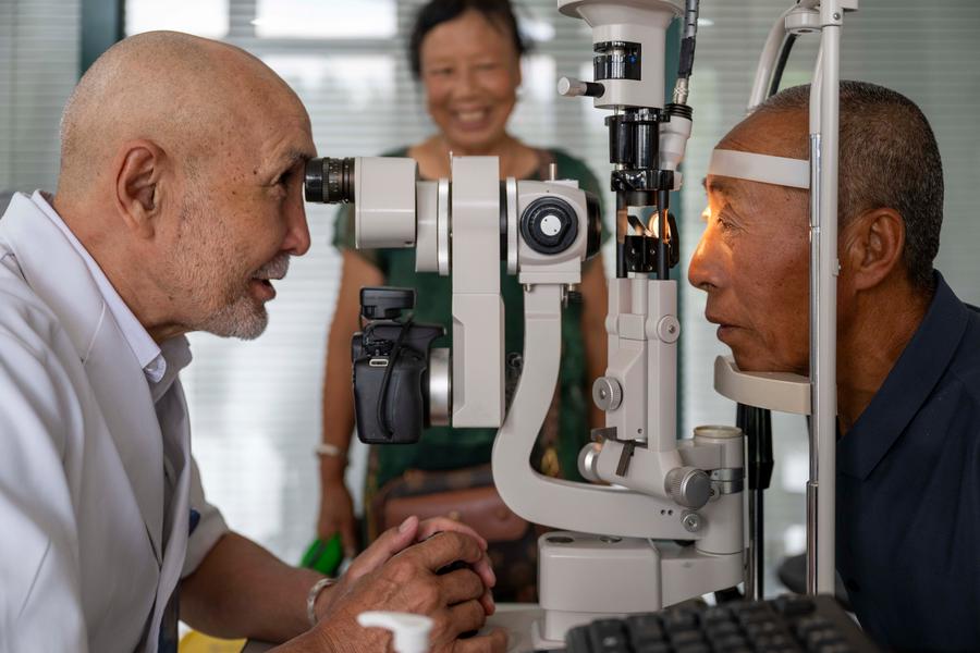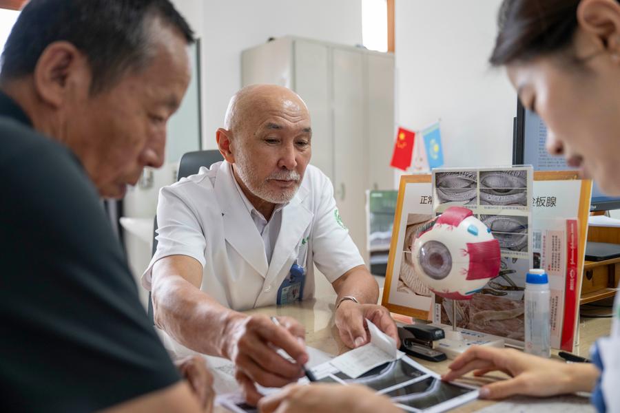 Saulebek Kabylbekov conducts examination for a patient at Daqing Ophthalmology Hospital in Daqing City, northeast China's Heilongjiang Province, July 16, 2025. (Xinhua/Zhang Tao)