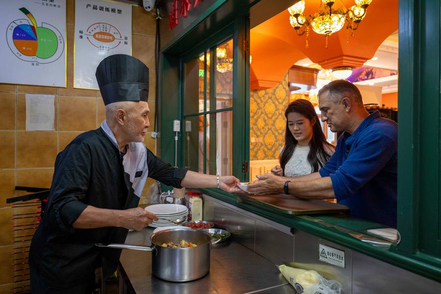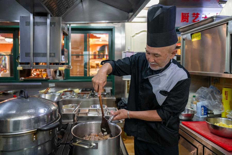 Saulebek Kabylbekov makes Kazakh cuisine at a canteen of Daqing Ophthalmology Hospital in Daqing City, northeast China's Heilongjiang Province, July 16, 2025. (Xinhua/Zhang Tao)