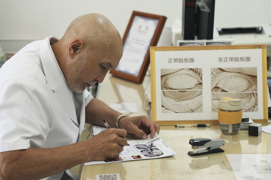 Saulebek Kabylbekov writes a medical record at Daqing Ophthalmology Hospital in Daqing City, northeast China's Heilongjiang Province, Aug. 8, 2025. (Xinhua/Zhang Qiming)