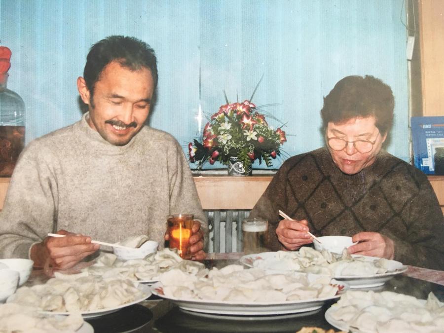 This is a file photo of Saulebek Kabylbekov (L) eating dumplings during the Spring Festival in China in 2002. (Xinhua)