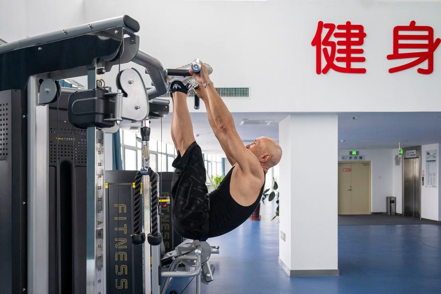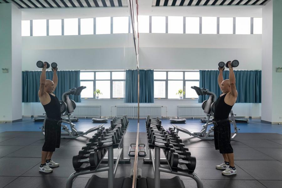 Saulebek Kabylbekov works out at a gym of Daqing Ophthalmology Hospital in Daqing City, northeast China's Heilongjiang Province, July 17, 2025. (Xinhua/Zhang Tao)