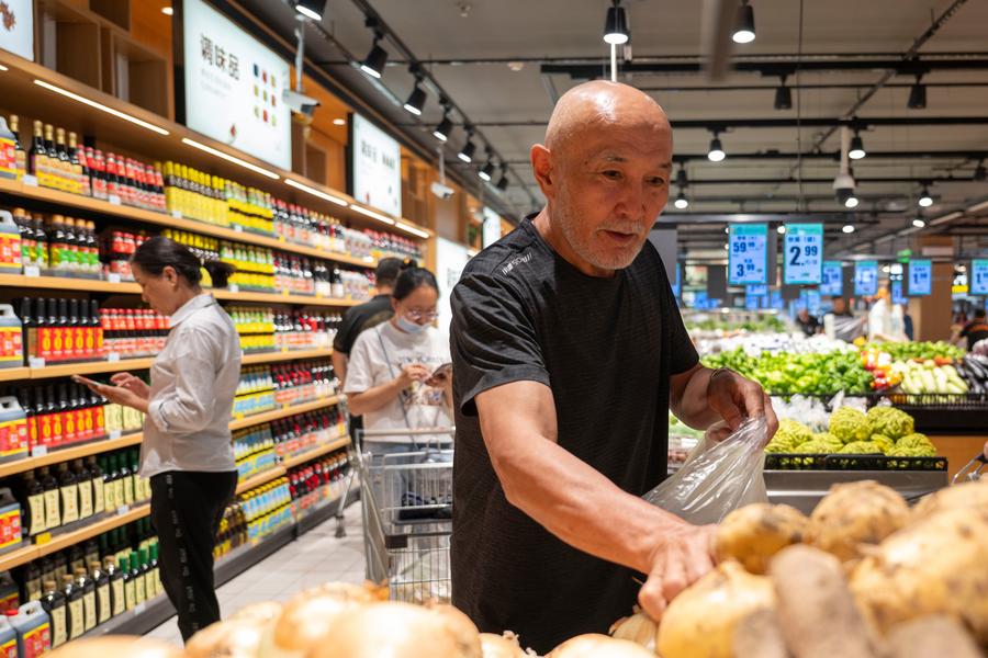 Saulebek Kabylbekov selects potatoes at a supermarket in Daqing City, northeast China's Heilongjiang Province, July 16, 2025. (Xinhua/Zhang Tao)