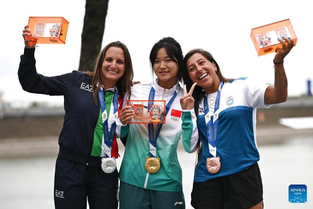 Gold medalist Xu Lu (C) of China, silver medalist Alice Virag (L) of Italy and bronze medalist Eugenia de Armas of Argentina pose during the awarding ceremony for the women's wakeboard freestyle of Waterski & Wakeboard event at The World Games 2025 in Chengdu, southwest China's Sichuan Province, Aug. 10, 2025. (Xinhua/Chen Zhenhai)