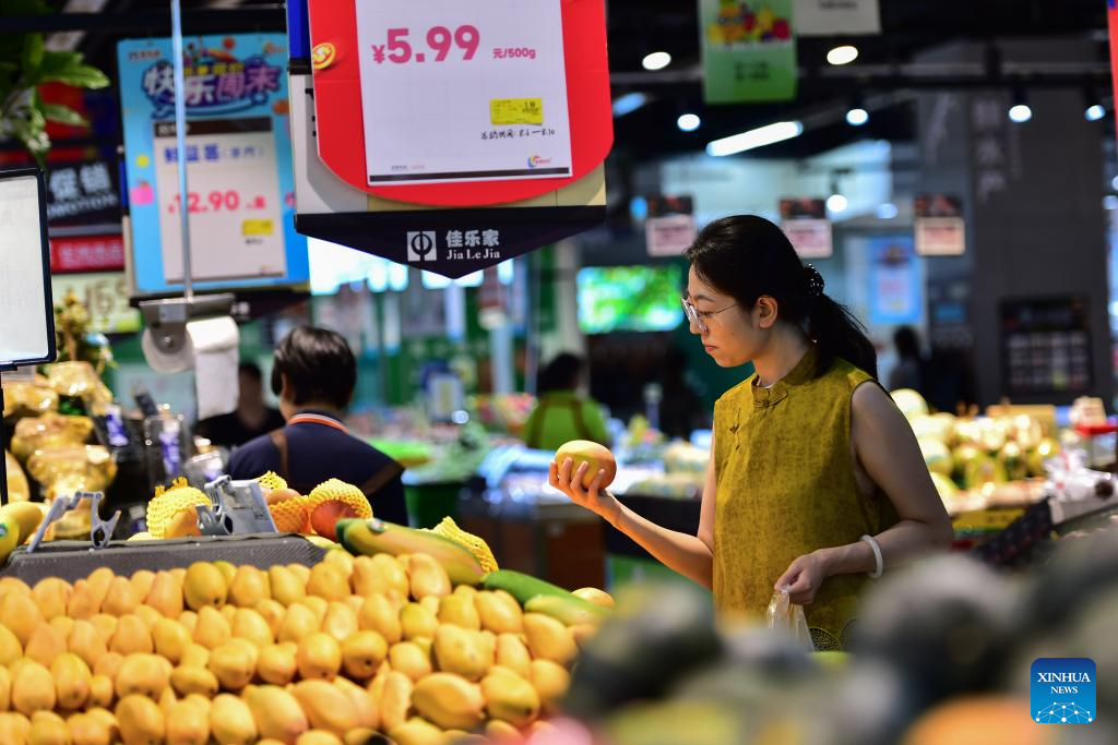 A woman buys fruits at a supermarket in Qingzhou City, east China's Shandong Province, Aug. 9, 2025. China's consumer price index (CPI), a main gauge of inflation, climbed 0.4 percent in July compared with the previous month, reversing a 0.1-percent drop in June and exceeding the average seasonal pace of 0.3 percent, data from the National Bureau of Statistics (NBS) showed Saturday. (Photo by Wang Jilin/Xinhua)