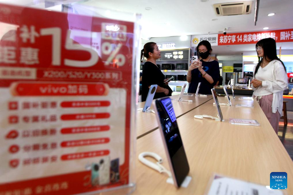 A man selects mobile phone at a shop in Binzhou City, east China's Shandong Province, Aug. 9, 2025. China's consumer price index (CPI), a main gauge of inflation, climbed 0.4 percent in July compared with the previous month, reversing a 0.1-percent drop in June and exceeding the average seasonal pace of 0.3 percent, data from the National Bureau of Statistics (NBS) showed Saturday. (Photo by Chu Baorui/Xinhua)