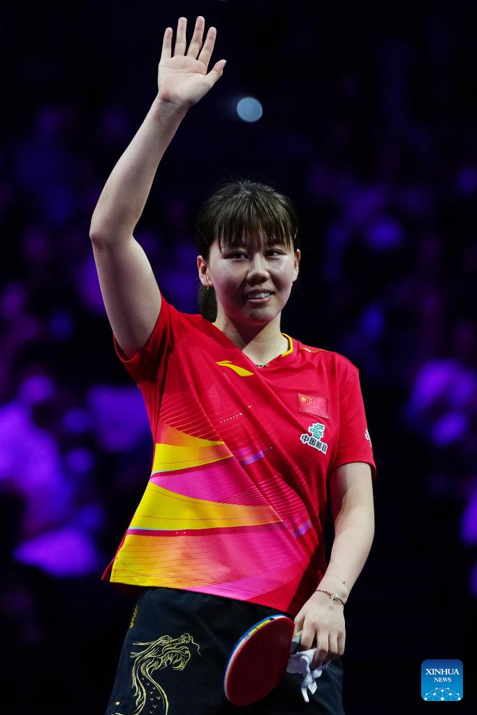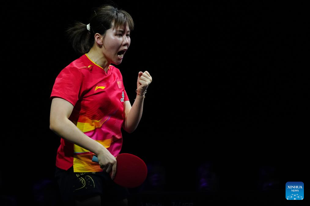 Chen Xingtong celebrates during the women's singles final match between Chen Xingtong of China and Sun Yingsha of China at the WTT Champions Yokohama 2025 in Yokohama, Japan, Aug. 11, 2025. (Xinhua/Jia Haocheng)