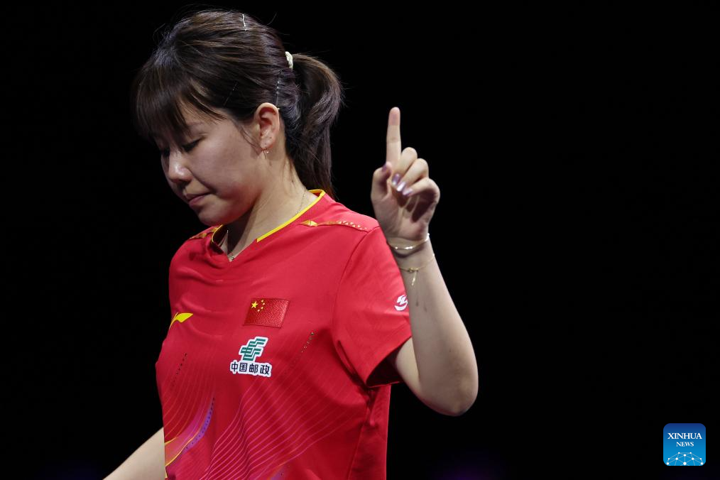 Sun Yingsha reacts during the women's singles final match between Chen Xingtong of China and Sun Yingsha of China at the WTT Champions Yokohama 2025 in Yokohama, Japan, Aug. 11, 2025. (Xinhua/Jia Haocheng)