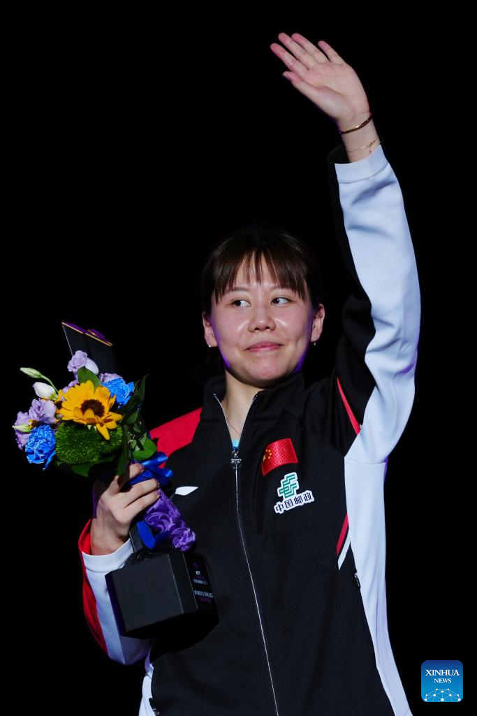Chen Xingtong greets the spectators during the awarding ceremony after the women's singles final match between Chen Xingtong of China and Sun Yingsha of China at the WTT Champions Yokohama 2025 in Yokohama, Japan, Aug. 11, 2025. (Xinhua/Jia Haocheng)