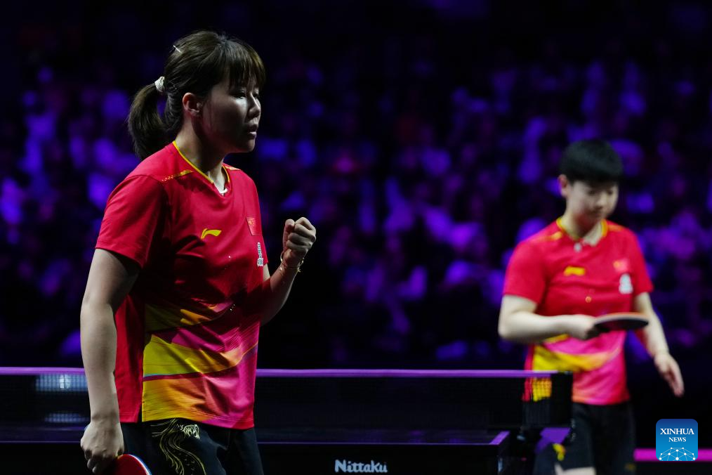 Chen Xingtong (L) celebrates during the women's singles final match between Chen Xingtong of China and Sun Yingsha of China at the WTT Champions Yokohama 2025 in Yokohama, Japan, Aug. 11, 2025. (Xinhua/Jia Haocheng)