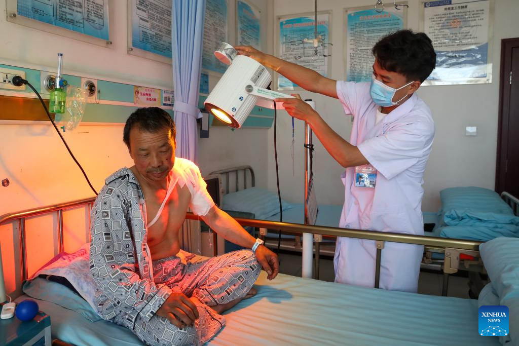 Medical staff members treat an injured (1st L) with shoulder brace and infusion at the first people's hospital of Yuzhong County, in Yuzhong, Lanzhou City, northwest China's Gansu Province, Aug. 11, 2025. Since the mountain torrents occurred in Yuzhong County, the provincial health department has dispatched 26 medical experts to the first people's hospital of the county to guide the treatment of the injured. At present, all the 15 injured people, who have been transferred to the hospitals at the provincial and county levels for treatment, have been out of danger. (Xinhua/Lang Bingbing)