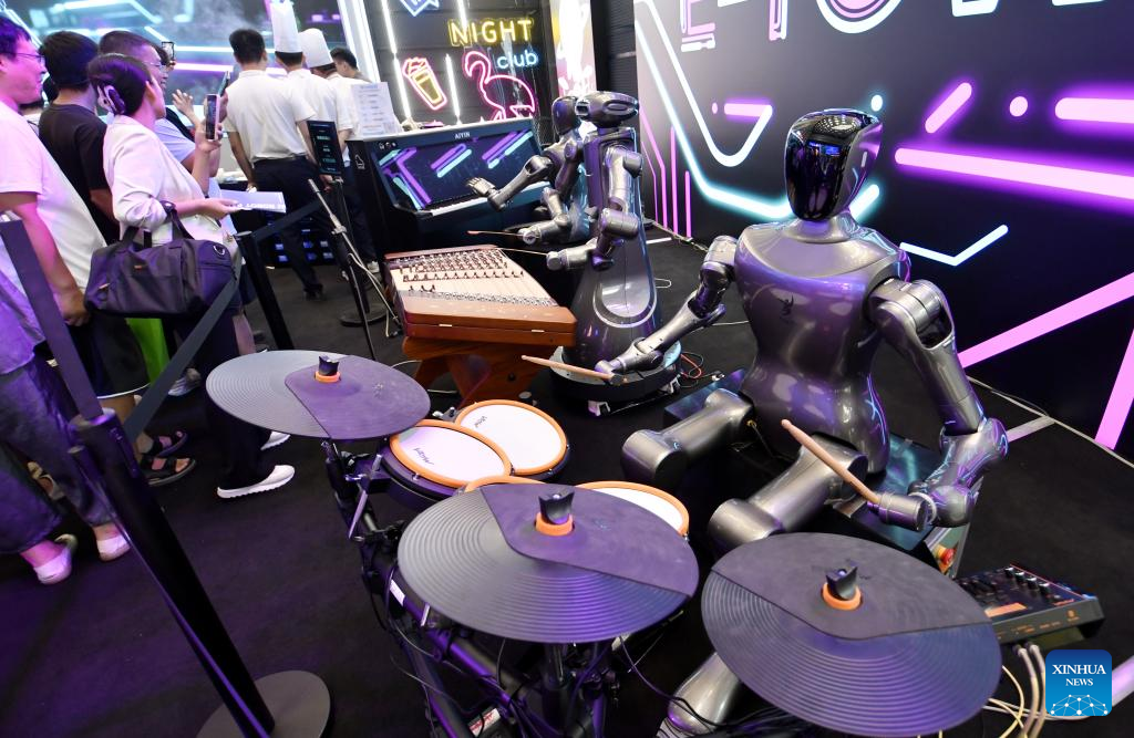 A robot band is displayed at the 2025 World Robot Conference (WRC) in Beijing, capital of China, Aug. 8, 2025. The WRC 2025 showcases rapidly advancing embodied intelligence technology, with humanoid robots as the highlight, demonstrating significant progress achieved globally and particularly in China, while the event also serves to illuminate a wide range of future commercial application scenarios.