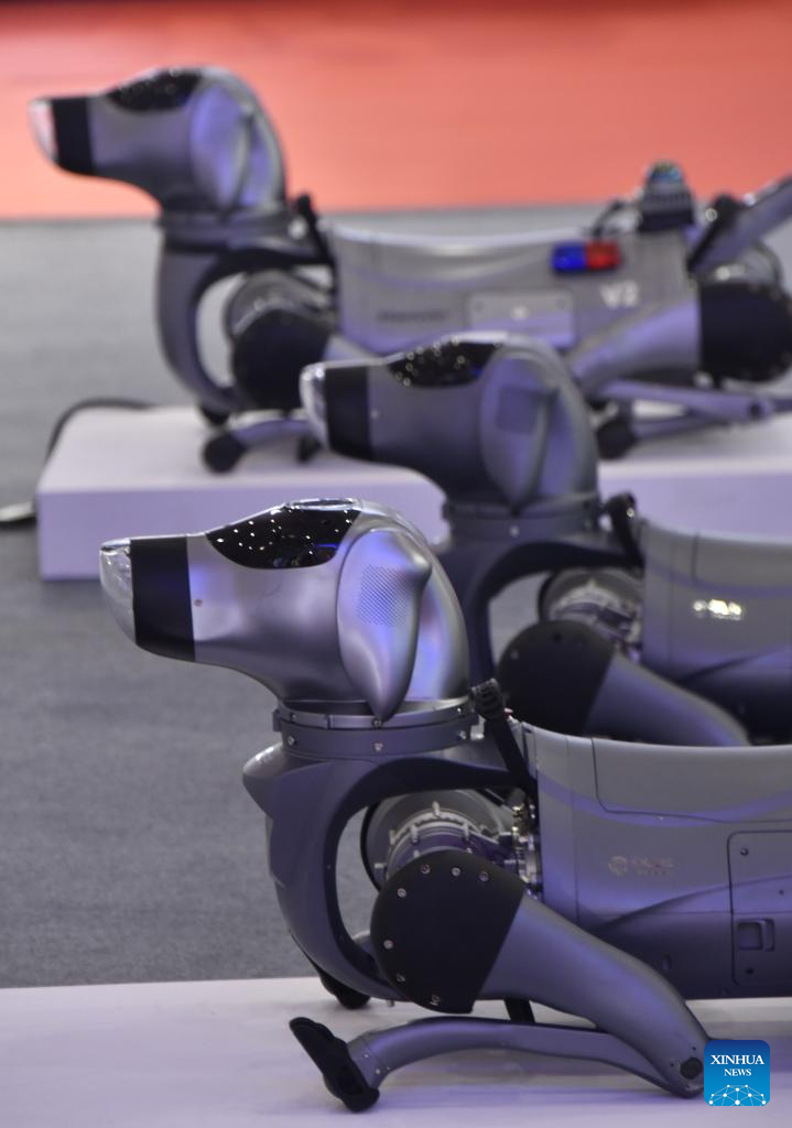 Robot dogs are exhibited during the 2025 World Robot Conference (WRC) in Beijing, capital of China, Aug. 8, 2025. The WRC 2025 showcases rapidly advancing embodied intelligence technology, with humanoid robots as the highlight, demonstrating significant progress achieved globally and particularly in China, while the event also serves to illuminate a wide range of future commercial application scenarios.