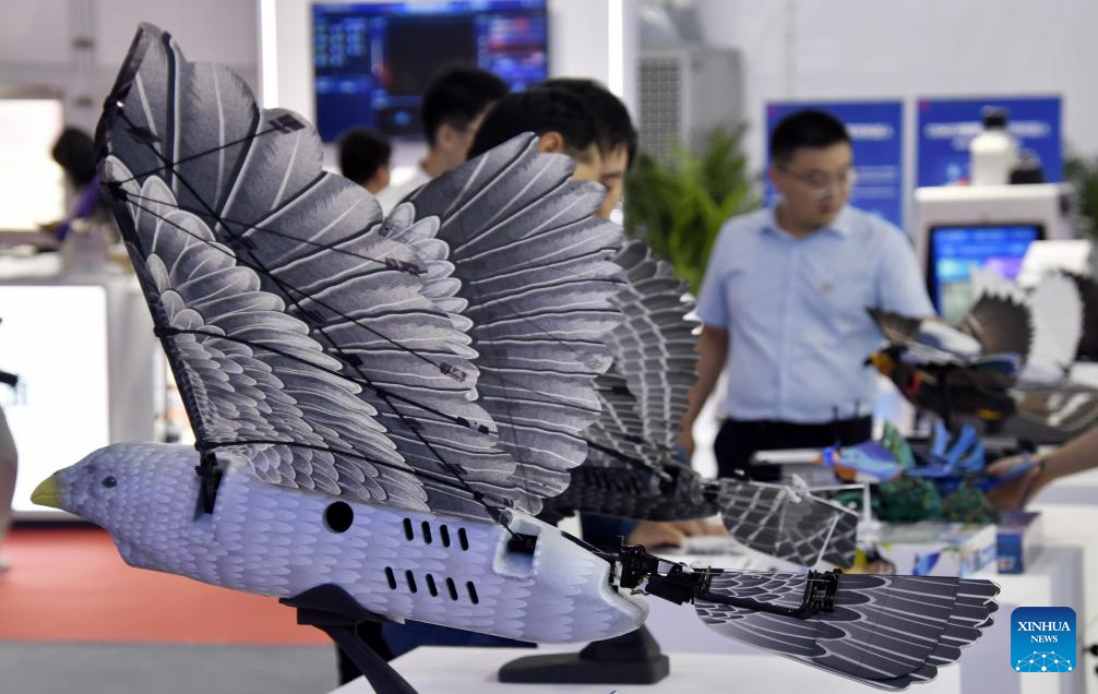 A bionic bird robot is displayed at the 2025 World Robot Conference (WRC) in Beijing, capital of China, Aug. 8, 2025. The WRC 2025 showcases rapidly advancing embodied intelligence technology, with humanoid robots as the highlight, demonstrating significant progress achieved globally and particularly in China, while the event also serves to illuminate a wide range of future commercial application scenarios.