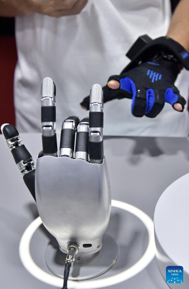 A visitor interacts with a mechanical hand at the 2025 World Robot Conference (WRC) in Beijing, capital of China, Aug. 8, 2025. The WRC 2025 showcases rapidly advancing embodied intelligence technology, with humanoid robots as the highlight, demonstrating significant progress achieved globally and particularly in China, while the event also serves to illuminate a wide range of future commercial application scenarios.