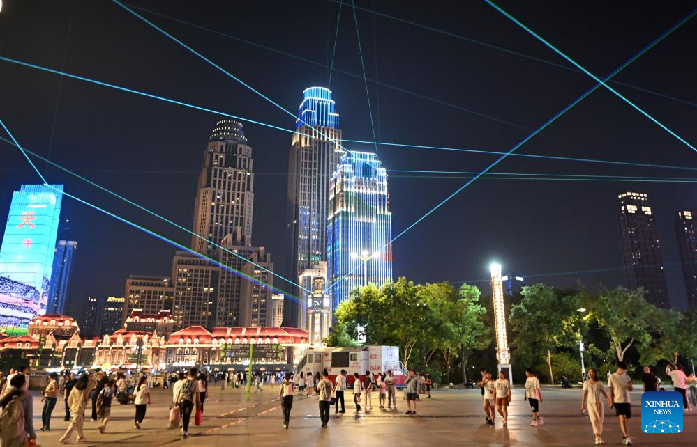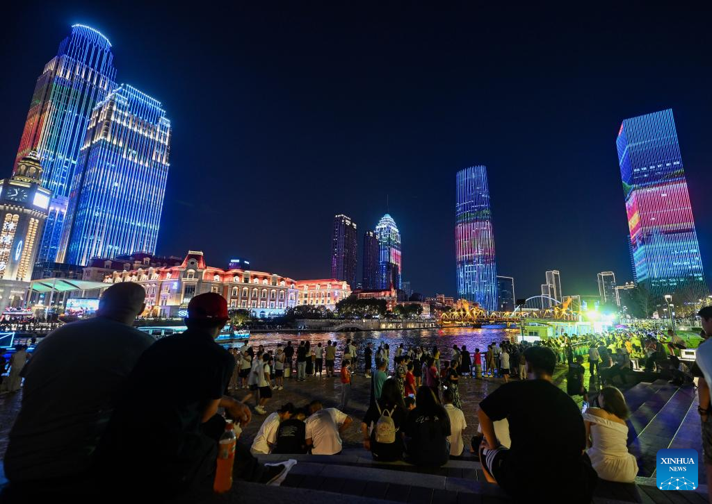 People stroll at a square by the Haihe River in north China's Tianjin, Aug. 11, 2025. Light installations and illuminated landmark buildings along the river together present a dazzling cityscape for citizens and tourists. (Xinhua/Zhao Zishuo)